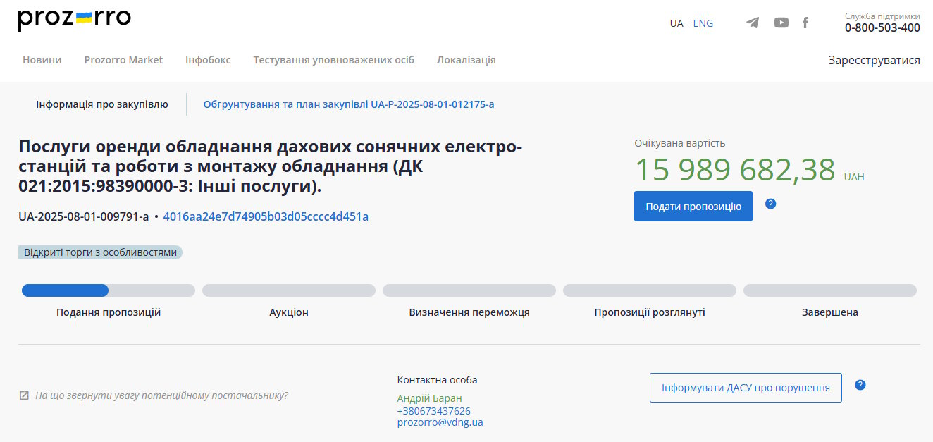 Відповідна інформація про оголошення про тендер розміщена на сайті електронних закупівель Prozorro .