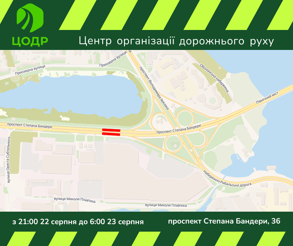 Крім того, тимчасові обмеження будуть запроваджені в ніч з 22 на 23 серпня навпроти торгового центру Blockbuster Mall за адресою проспект Степана Бандери, 36. Фахівці Центру організації дорожнього руху встановлять дорожні знаки змінної інформації за допомогою спеціального обладнання.