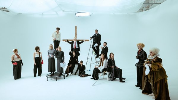 Христя Люба, Ілля Чопоров, В’ячеслав Бабенков, Артем Ємцов у зйомках відео до вистави “Орландо”. Важливо: промоційні матеріали відрізняються від сценографії. Мітя Бородін/надано Суспільне Культура