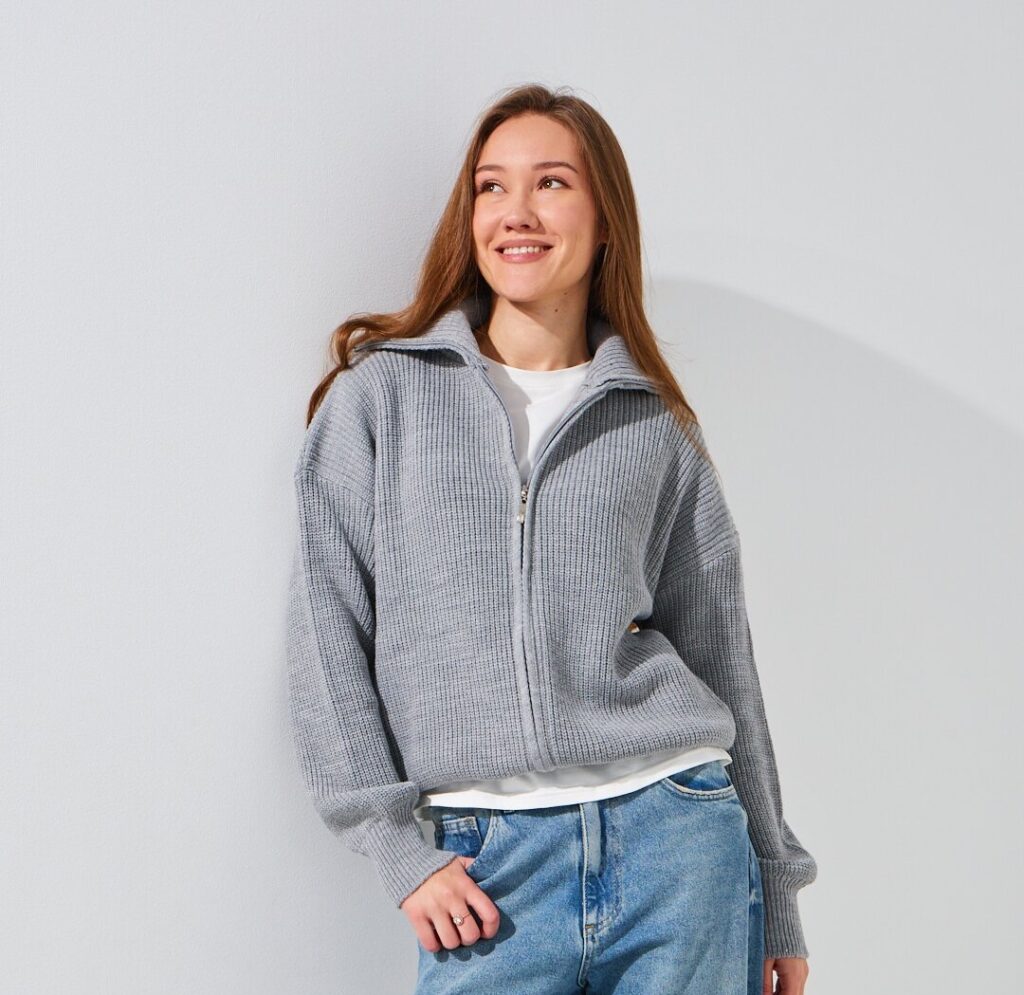 Кардиган — це кофтинка на ґудзиках або без застібок, яку зручно накидати поверх футболки чи блузи. Він підходить як для офісу, так і для повсякденного образу.