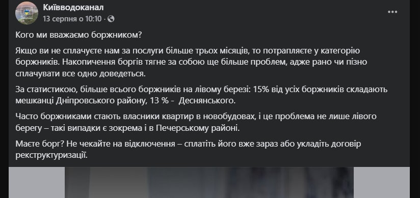 Прес-служба «Київводоканалу» опублікувала черговий заклик негайно сплатити борги на початку вересня. Згідно з повідомленням , загальна сума боргів киян за воду становить 246,5 мільйона гривень , а кількість позовів, поданих «Київводоканалом» проти боржників, наближається до чотирьох тисяч . Компанія також поділилася інформативною географічною статистикою : за даними «Київводоканалу», найнеохоче платять за воду мешканці лівобережжя: 15 відсотків усіх боргів припадає на Дніпровський район і ще 13 відсотків – на Деснянський район.