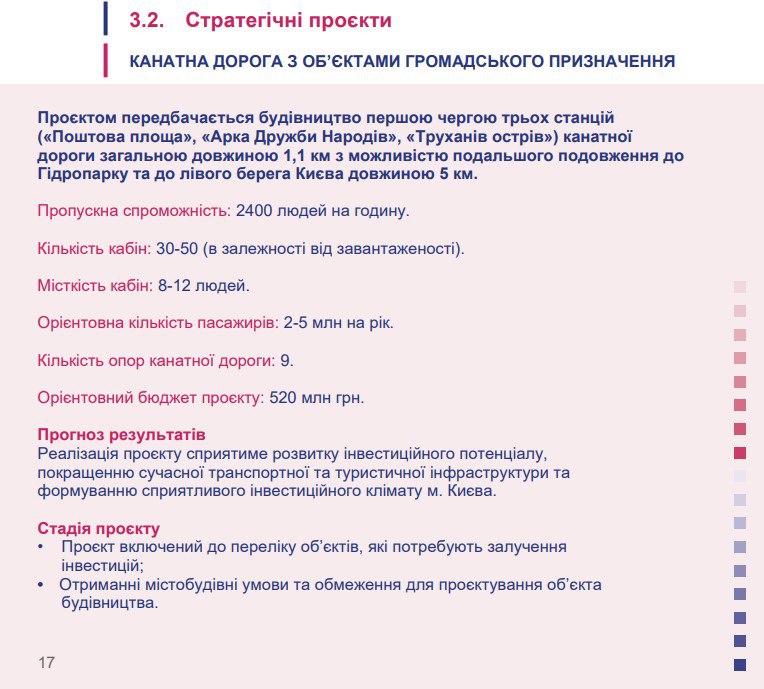 Дуже цікавим є розділ «Стратегічні проекти» в Інвестиційному паспорті Києва. Міська влада запланувала будівництво канатної дороги. «Проект передбачає будівництво трьох станцій («Поштова площа», «Арка Свободи Українського народу», «Труханів острів») канатної дороги загальною протяжністю 1,1 км з можливістю подальшого продовження до Гідропарку та лівого берега Києва протяжністю 5 км». Орієнтовний бюджет проекту становить 520 мільйонів гривень.