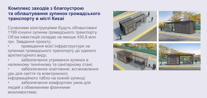 Якщо ми відкриємо Інвестиційний паспорт Києва , який був підготовлений ще до масштабної війни, то дізнаємося про «приклади масштабних інвестиційних проектів, що реалізуються». Один з них – «комплекс заходів щодо покращення та облаштування зупинок громадського транспорту в Києві». Це передбачає «приведення всієї інфраструктури на зупинках громадського транспорту до єдиної архітектурної форми». Серед іншого, на кожній зупинці буде встановлено електронне інформаційне табло. Принаймні так обіцяли.