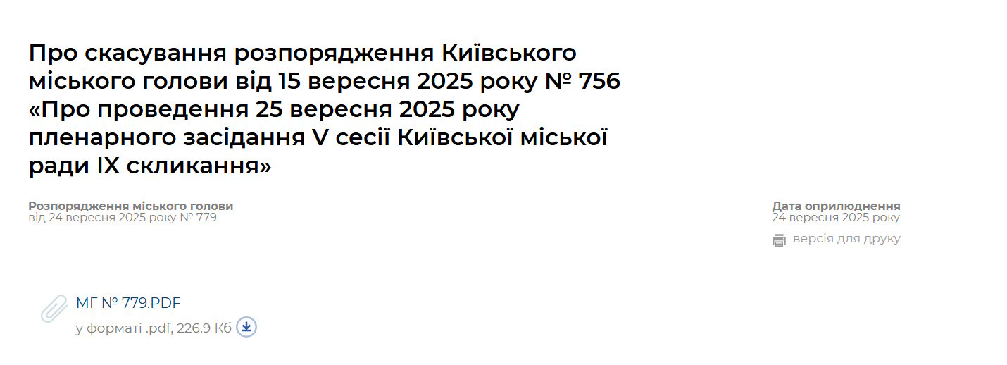 Мер Віталій Кличко скасував пленарне засідання Київської міської ради, яке мало відбутися у четвер, 25 вересня. Чутки про скасування з’явилися ще вдень 24 вересня, але відповідне розпорядження було опубліковано на сайті КМДА лише пізно ввечері.