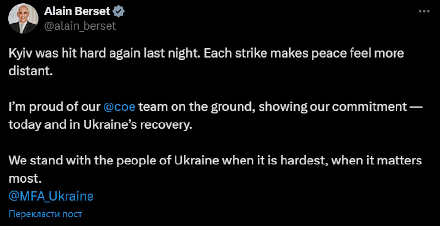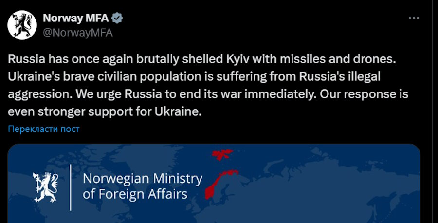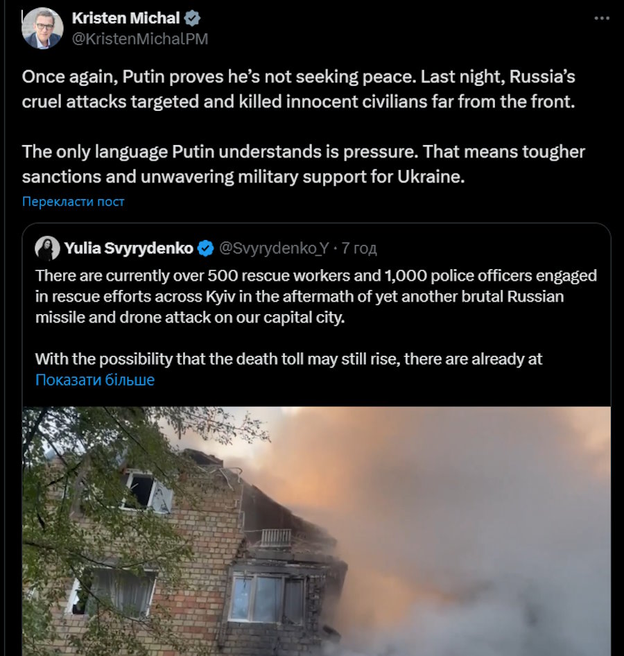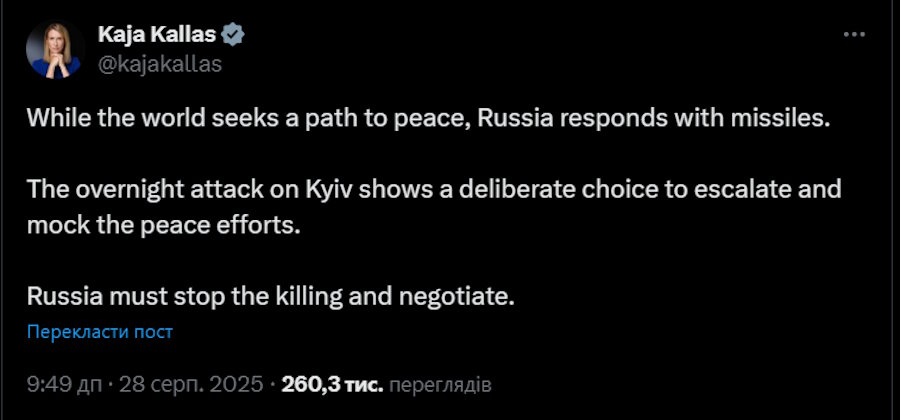 Верховний представник ЄС Кайя Каллас заявила в ефірі X: «Удари Росії є насміханням над мирними зусиллями. Поки світові лідери домагаються діалогу, Москва відповідає насильством».