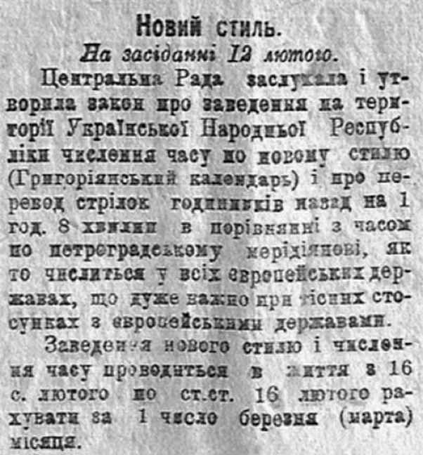 Різкі зміни відбулися у 20 столітті після розпаду імперій. У 1918 році більшовицька Росія перейшла на григоріанський календар, відмовившись від 13 днів для синхронізації з Європою. Того ж року, з лютого, УНР також запровадила новий стиль, хоча Православна Церква продовжувала дотримуватися юліанського календаря.