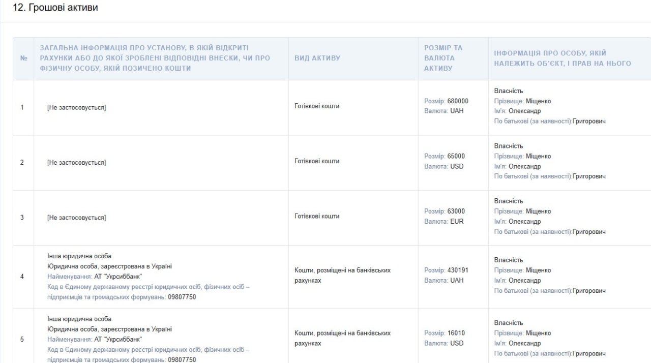 Не можемо не радіти й за добрий капітал Олександра Міщенка, який очолює КП «Центр організації дорожнього руху» та є депутатом Київської міської ради. Згідно з декларацією, Олександр Григорович має такі фінансові активи: готівкою зберігає 680 тисяч гривень, 65 тисяч доларів США, 63 тисячі євро. А на банківських рахунках зберігає 430 тисяч 191 гривню, 16 тисяч доларів США та 7 тисяч євро.