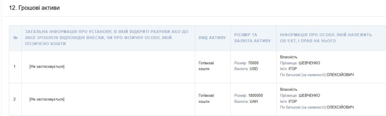 Порівняймо нинішній статок Ігоря Олексійовича з його декларацією за 2020 рік. На той час він зберігав готівкою лише 70 тисяч доларів США. Отже, за чотири роки фінансовий добробут Шевченка став вагомішим, гривня за гривнею – і «зріс» на 1 мільйон 780 тисяч гривень.