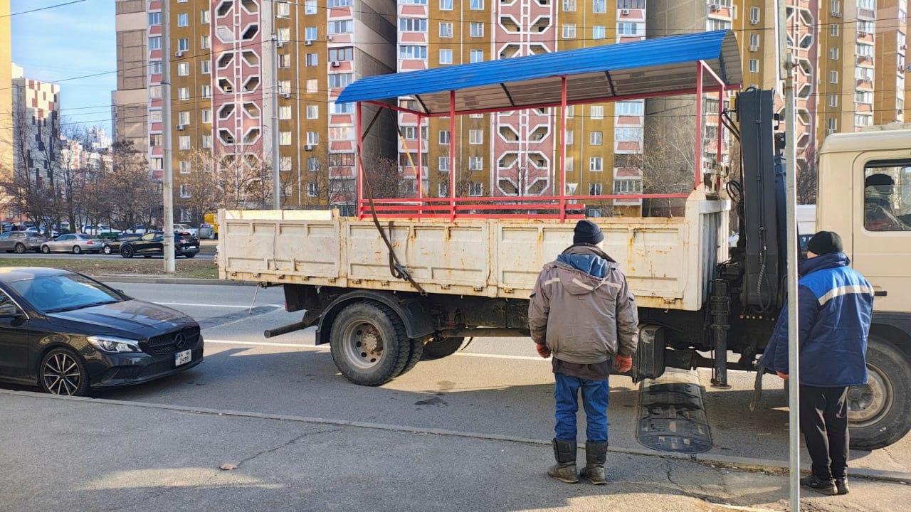 Демонтаж старої зупинки громадського транспорту. Фото: з відкритих джерел