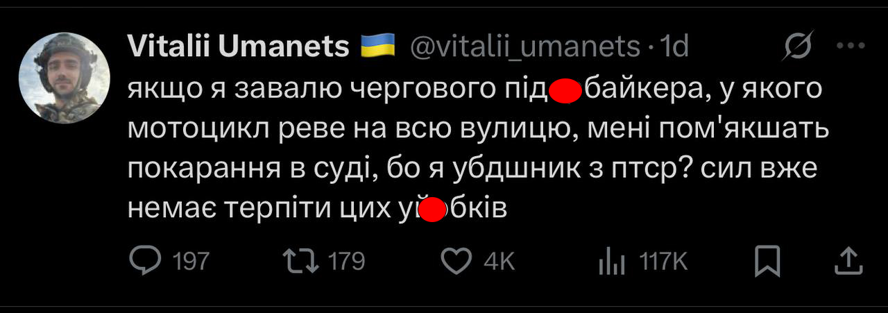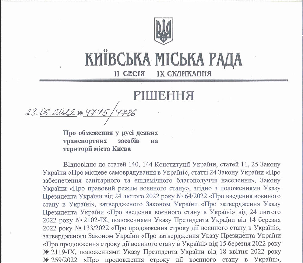 Київська міська рада 23 червня 2022 року ухвалила рішення «Про обмеження руху певних транспортних засобів на території міста Києва», яке мало на меті захистити психіку мешканців столиці від тригерних звуків на дорогах. Згідно з ним, рух транспортних засобів, що використовують вихлопні системи без шумопоглинача, визнано таким, що «порушує права та законні інтереси мешканців міста Києва, негативно впливає на їхній психоемоційний стан та потребує заборони до припинення або скасування правового режиму воєнного стану на всій території України».