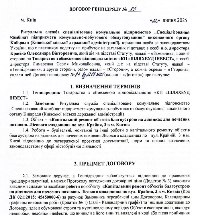 22 липня 2025 року Спеціалізоване комунальне підприємство ритуальних послуг «Спеціалізований комбінат підприємств комунального та побутового обслуговування» уклало угоду з компанією «КП «Шляхбуд Інвест» на 298 мільйонів 531 тисячу 792 гривень. Документ підписали виконувач обов’язків директора підприємства Олександр Красіко та керівник компанії «КП «Шляхбуд Інвест» Сергій Лимаренко.