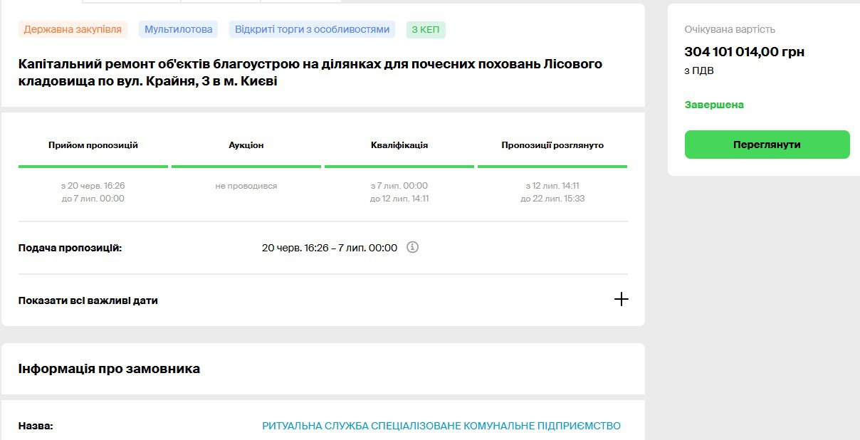 14 липня Похоронна служба розмістила оголошення про новий тендер на цей капітальний ремонт – він стосується послуг інженера-консультанта, а також технічного нагляду за капітальним ремонтом у зонах для почесних поховань. Вартість договору становить 9 мільйонів 988 тисяч 772 гривень. Отже, загалом з міського бюджету буде витрачено понад 300 мільйонів гривень.