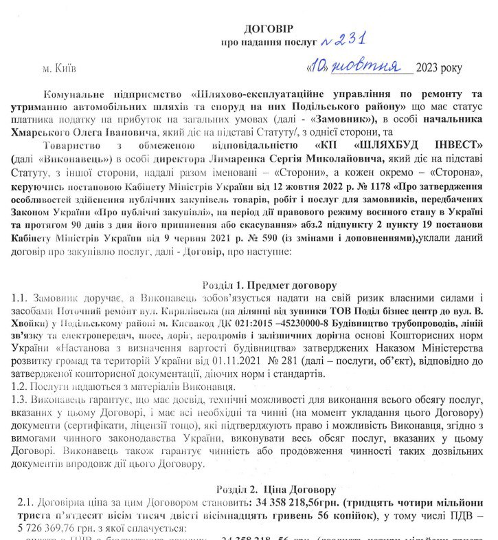 А перед цим, 9 жовтня 2023 року, компанії Лимаренка знову пощастило неймовірно. Він підписав контракт з комунальним підприємством «Дирекція з будівництва дорожньо-транспортних споруд Києва» на 149 мільйонів 79 тисяч гривень. Йшлося про будівництво під’їзної дороги з проспекту Валерія Лобановського, яка проходить повз Міжнародний аеропорт «Київ».